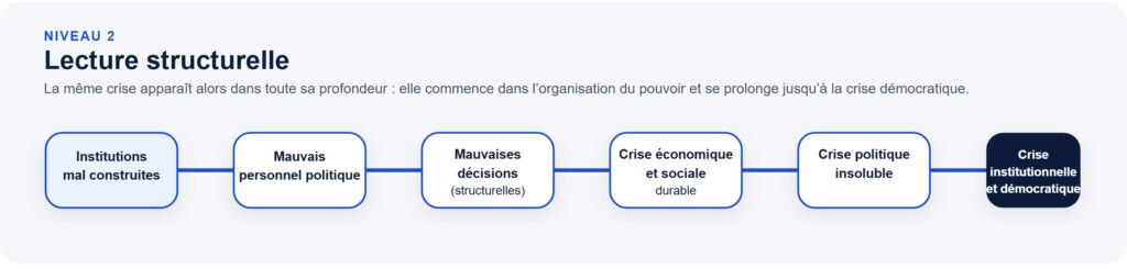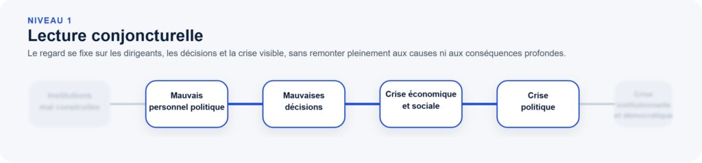 À ce premier niveau, le problème principal semble être la qualité des dirigeants et des partis. La crise apparaît comme le produit d’une mauvaise séquence historique : les mauvaises personnes gouvernent, prennent de mauvaises décisions, aggravent la situation du pays, puis alimentent le mécontentement politique.