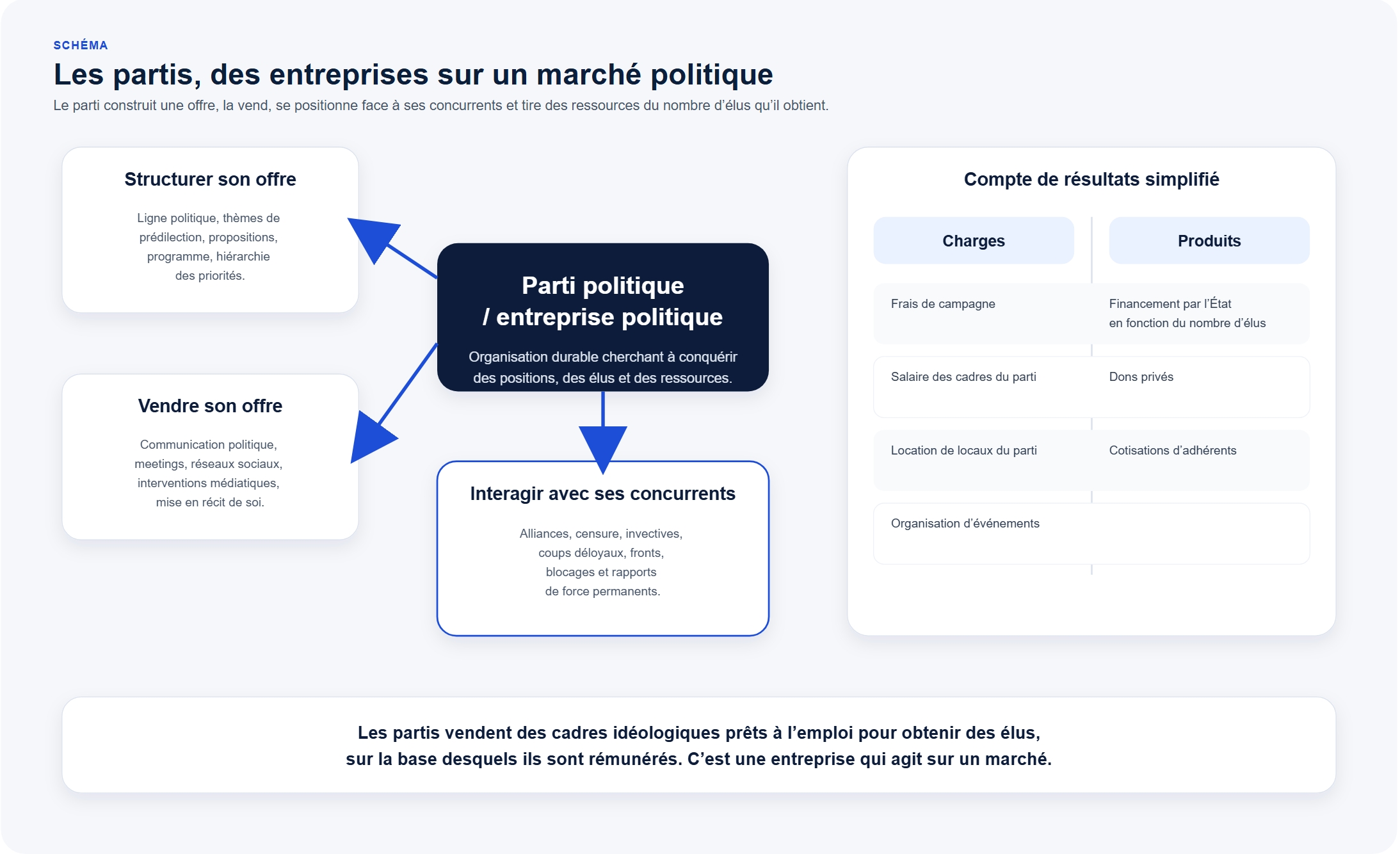 Dans les démocraties représentatives contemporaines, les partis ne se contentent pas de défendre des orientations. Ils se comportent aussi comme des acteurs en concurrence sur un marché politique périodique. La démocratie est rythmé par les élections qui fonctionnent comme un marché périodique où les partis se disputent des « parts de marché » — c’est-à-dire des postes, des budgets, des positions de pouvoir rémunérées et dotées de ressources. Les partis politiques agissent alors comme des entreprises concurrentes, cherchant à optimiser leur rendement électoral par la qualité de leur produit (leurs idées), par leur marketing (discours, slogans, posture, image) et par leurs stratégies d’alliance ou de blocage (coalitions, fronts républicains, barrages).