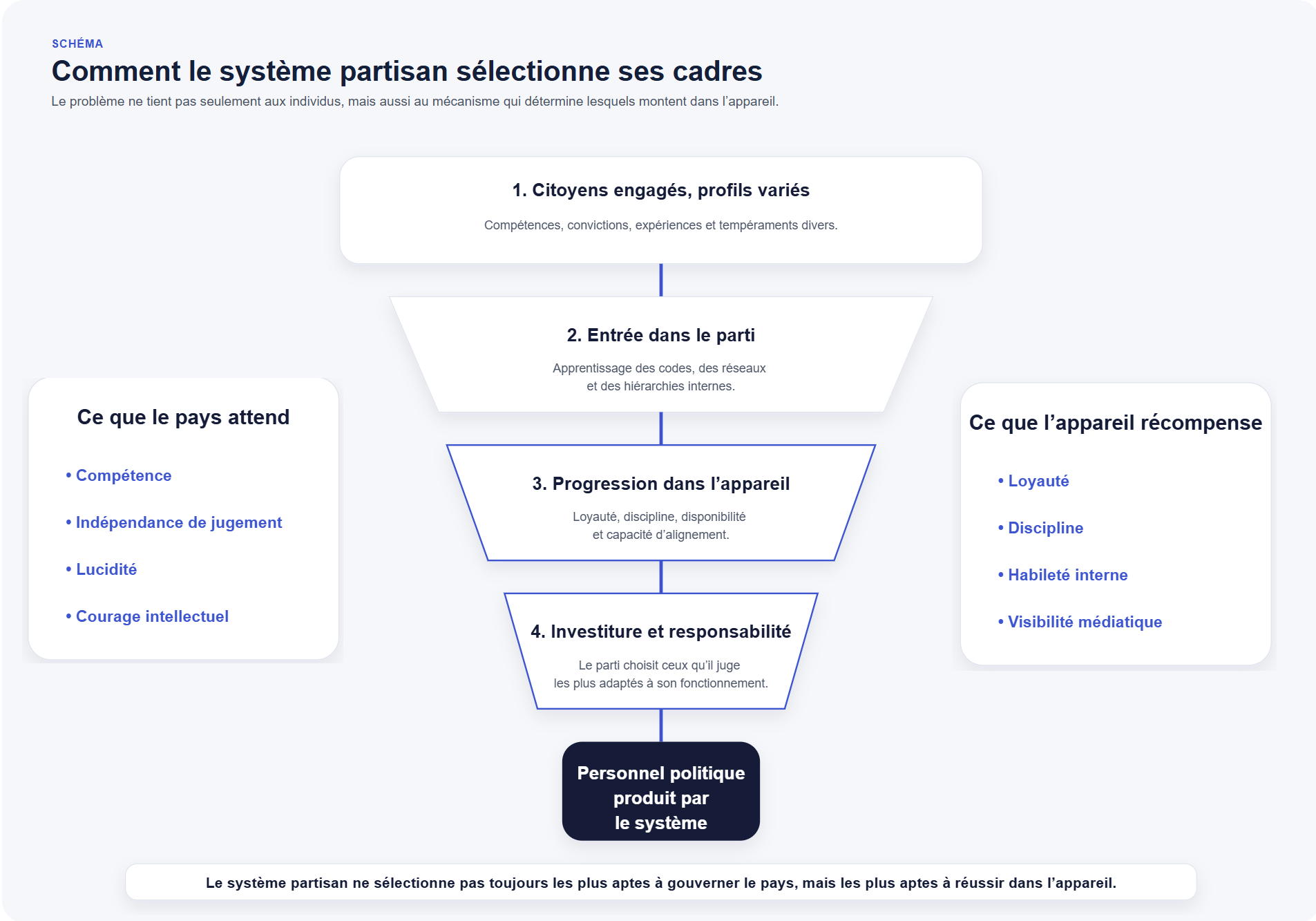 Les partis ne façonnent pas seulement le débat public. Ils jouent un rôle central dans la sélection de ceux qui accèdent aux responsabilités. Or cette sélection ne favorise pas toujours les qualités les plus utiles au pays.